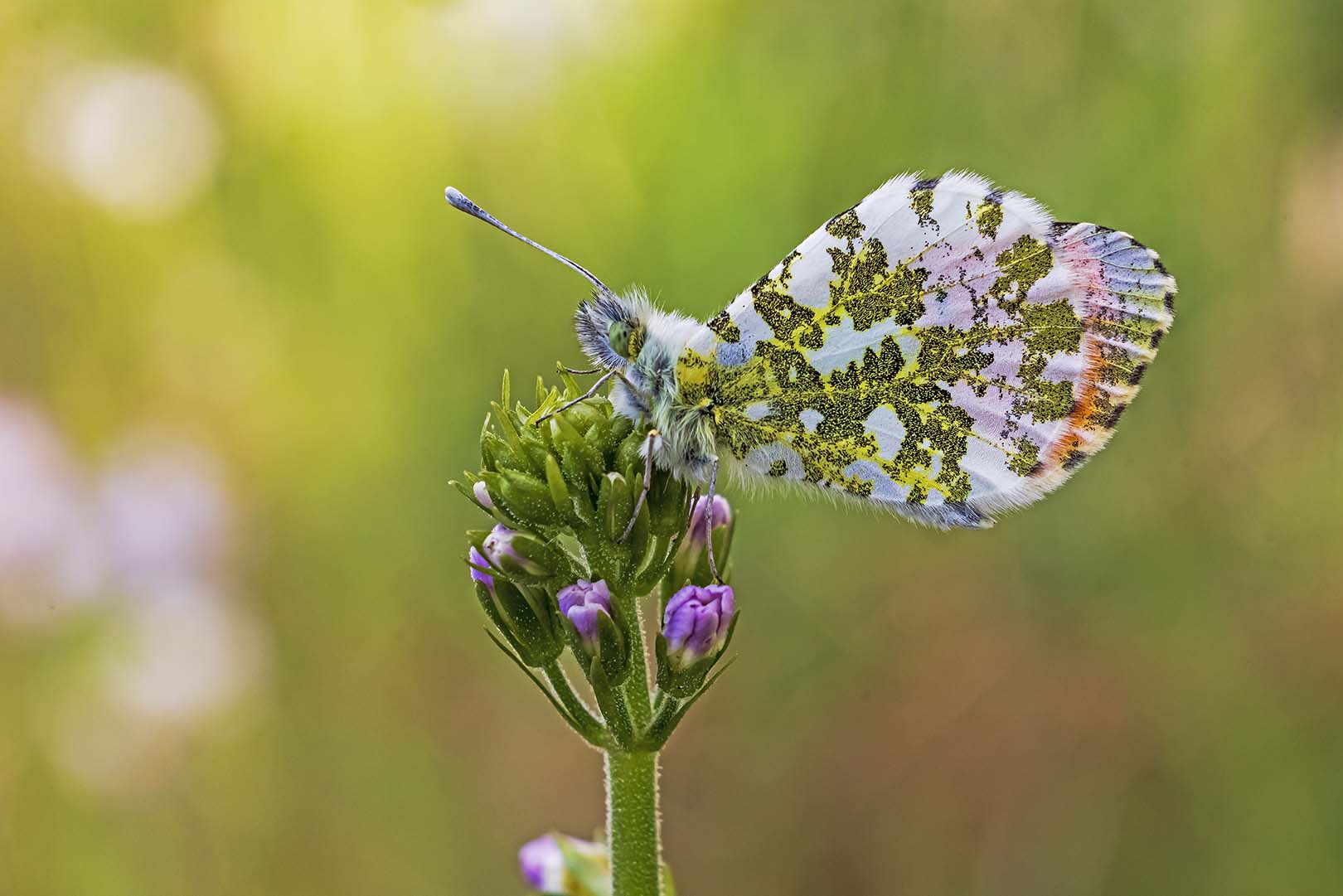 In een sloot in de Drentse Aa zitten verschillende Oranjetipjes te rusten op de waterviolier. De waterviolier stond in bloei en is een waterplant die veel voorkomen in kwelwater. Ze groeien in kwelwater omdat ze houden van water met weinig voedsel en mineralen zoals ijzer en kalk.